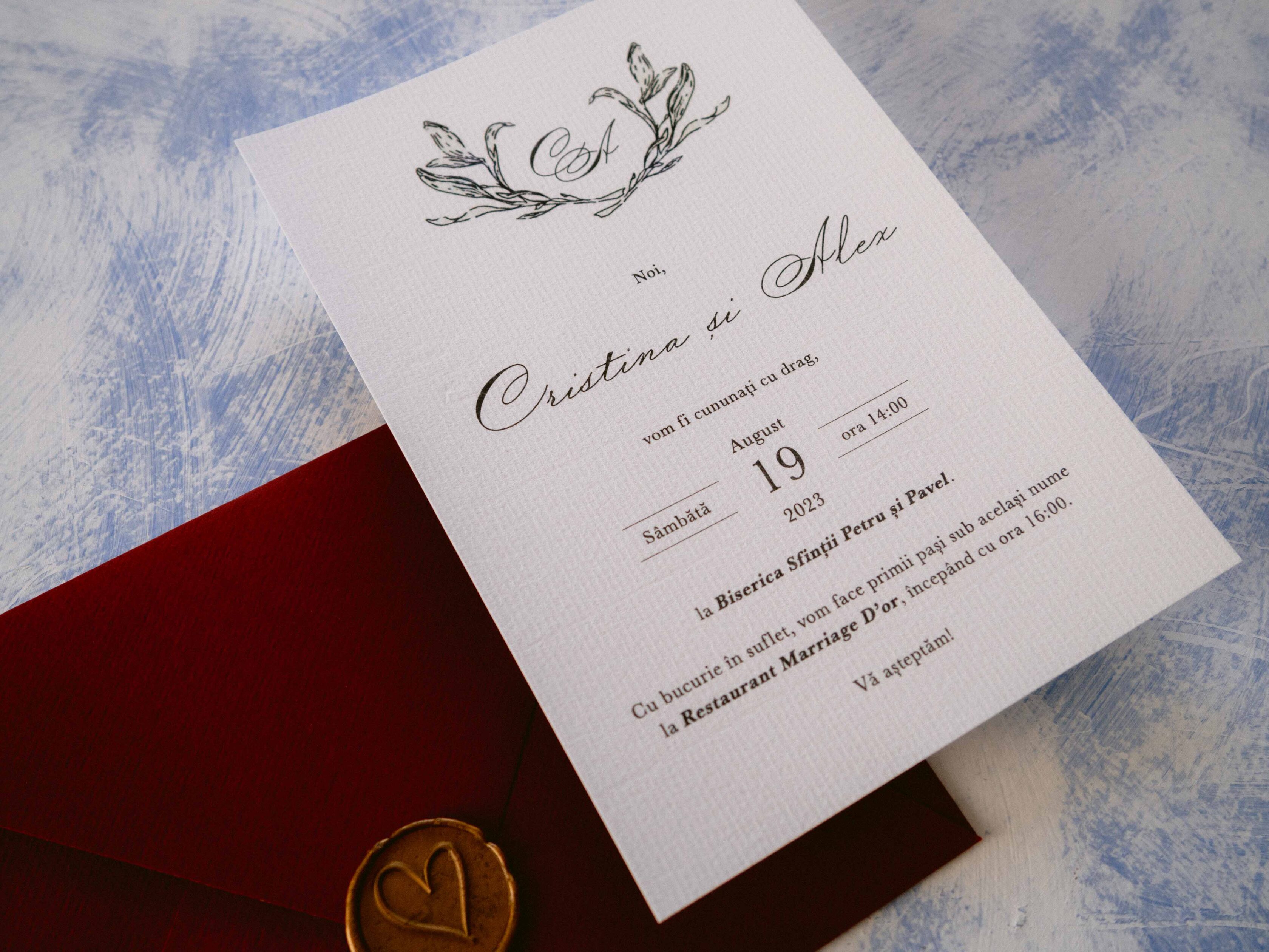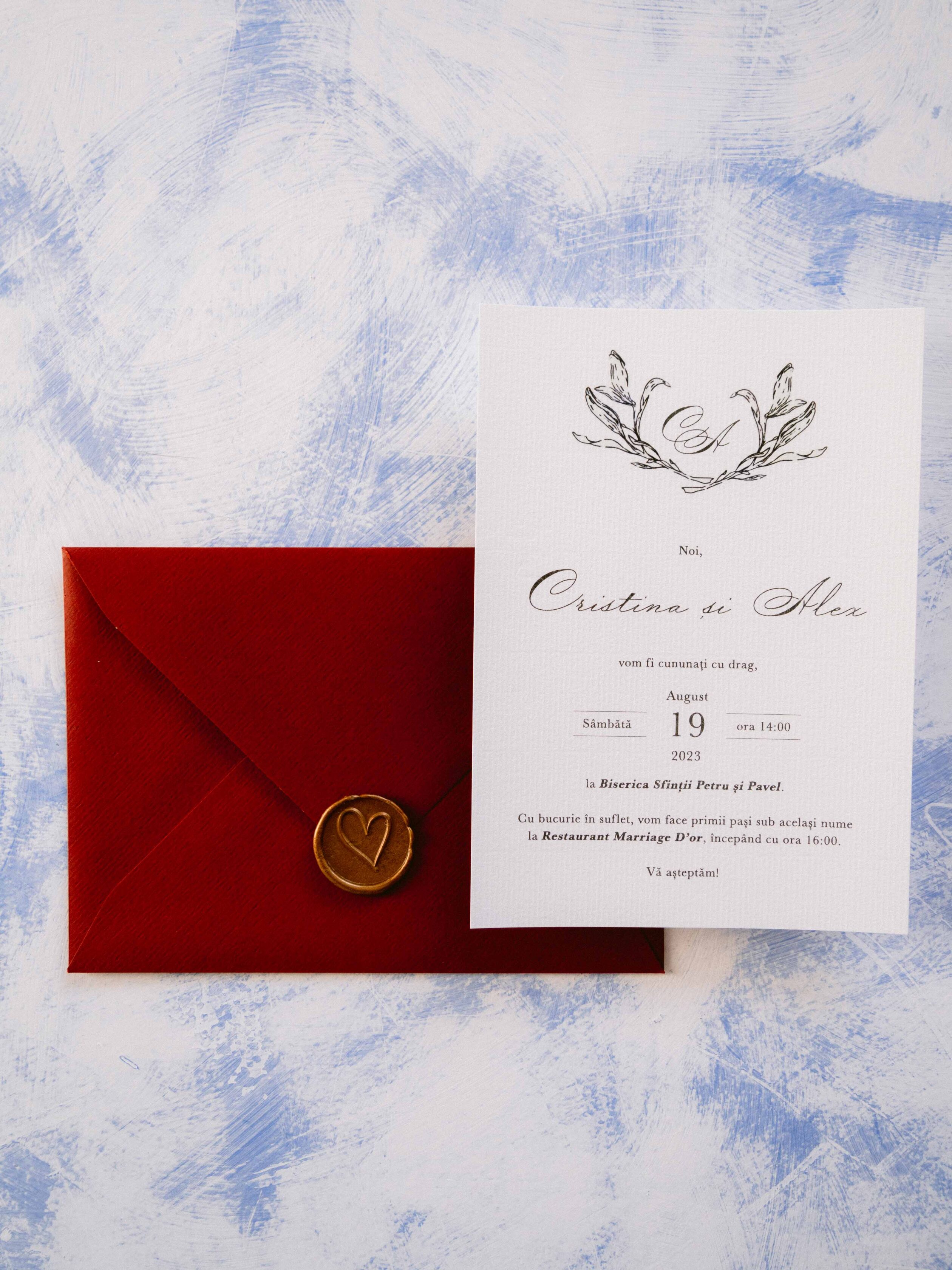 Invitația va fi imprimată digital pe carton texturat de 300 de grame. Va avea dimensiunea aproximativă de 12,5 x 17,5 cm și va fi compusă din invitație, plic în culoarea dorită și sigiliu din colecția art Stories.